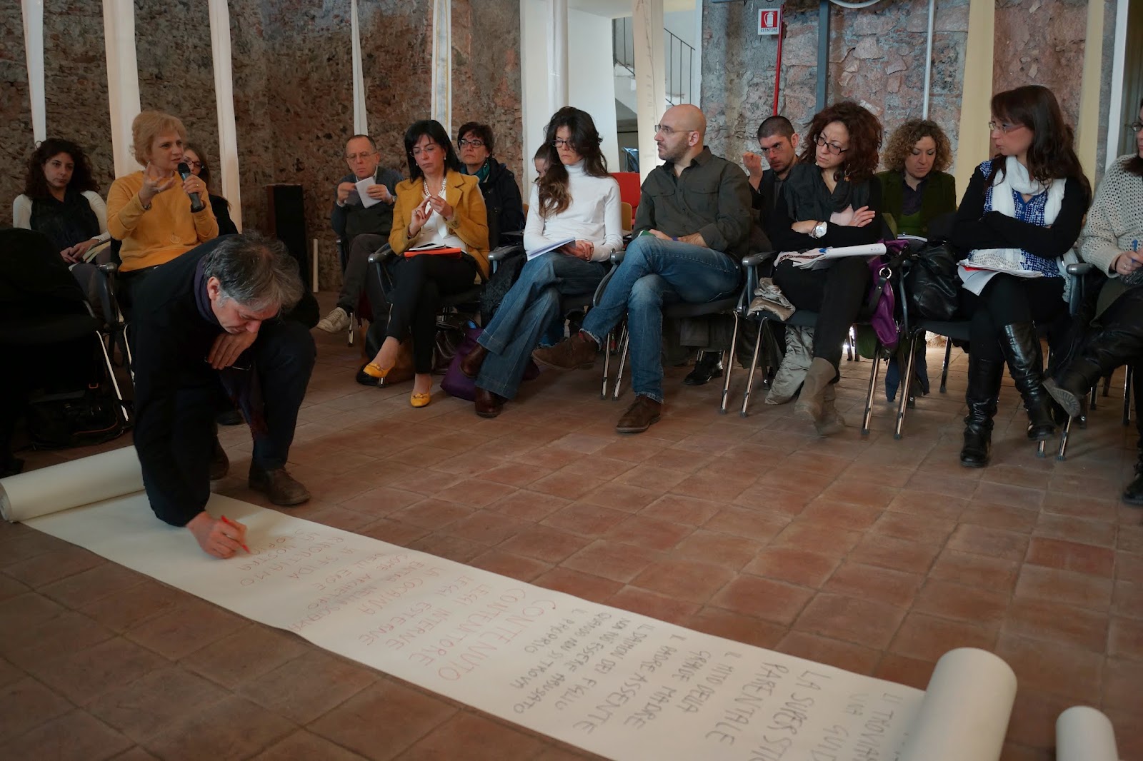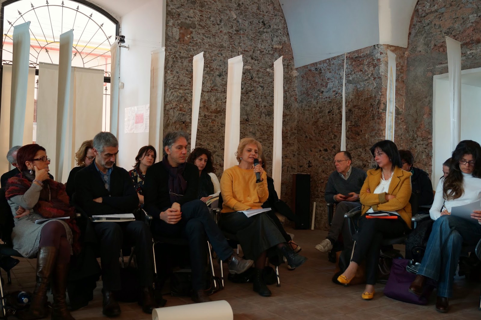 Lo spazio che ci accoglieva era l’Aula Magna del liceo scientifico Boggio Lera di Catania, (che ormai gentilmente ospita le nostre iniziative da più di un anno) allestito in un circolo di sedie contornate da una particolare istallazione, realizzata dagli architetti Giulia Di Natale e Claudio Montaudo, che permetteva agli astanti di fare già esperienza di un cerchio simbolico delimitato da tanti pannelli di carta sospesi da invisibili fili a raggiera, creando un percorso ‘concentrico’ e tortuoso per poter prendere posto.